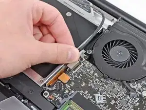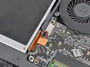 Если присутствует, возьмитесь за пластиковую вкладку, прикреплённую к разъёму аккумулятора, и потяните её в сторону переднего края устройства. Для моделей конца 2011 года у разъёма аккумулятора не будет вкладки — это просто штекер, который вставляется прямо в материнскую плату; чтобы снять его, подденьте штекер прямо вверх.