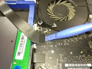Используйте плоский конец лопатки, чтобы поддеть коннектор антенны Bluetooth и приподнять его с гнезда на плате Bluetooth.