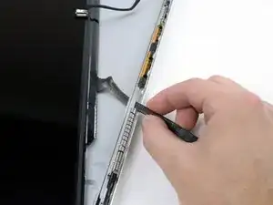 Используйте кончик лопатки, чтобы поджать и откинуть тонкую стальную фиксирующую защёлку, удерживающую кабель передачи данных дисплея в его гнезде на ЖК-дисплее.