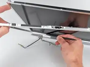 Теперь, когда верхний и левый края свободны, слегка приподнимите ЖК-матрицу из передней рамки, чтобы освободить место для поддевания стальной полосы вдоль нижнего края ЖК-матрицы от передней рамки.