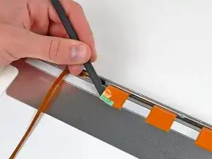Продвигайтесь вдоль верхнего края ЖК-матрицы, медленно отщёлкивая прикреплённую стальную полосу от передней рамки.