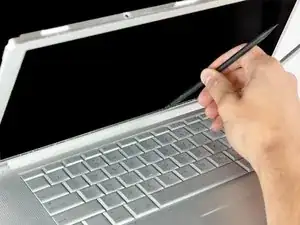 Удалите винт T6 Torx из нижнего левого угла сборки дисплея. Корпус компьютера не позволит вставить отвертку непосредственно в винт, поэтому будьте осторожны, чтобы не сорвать винт.