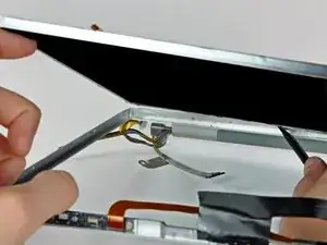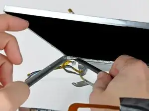 Используйте плоский конец лопатки, чтобы аккуратно приподнять один из верхних углов ЖК-дисплея из передней рамки.