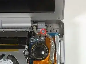 Удалите серебряный T6 Torx винт, закрепляющий петлю заземления на кабеле передачи данных дисплея к корпусу.