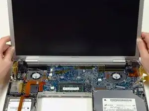 Возьмитесь за узел дисплея с обеих сторон и поднимите его вверх и выньте из компьютера.