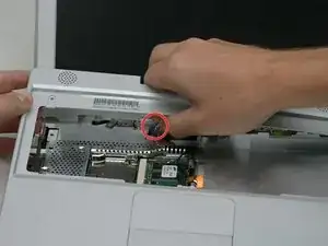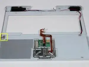 Ослабьте разъём трекпада, слегка подтянув верхнюю деталь вверх, освободив ленточный кабель трекпада.
