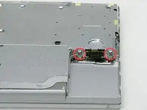Выдвиньте оптический привод ещё немного, чтобы получить доступ и снять второй филипсовый винт рядом с разъёмом питания.