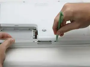 Продолжайте вести лопаточку вокруг переднего правого угла. На стороне с портами есть две защёлки: одна ближе к переднему углу и одна рядом с выходом звука.