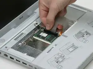Сдвиньте металлическую защёлку провода в направлении карты AirPort и потяните её вверх, чтобы освободить от экрана оперативной памяти.