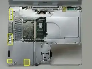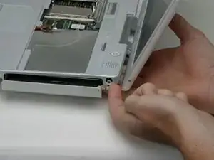 Возможно, к верхней крышке прикреплена тонкая металлическая планка двумя винтами по обе стороны оптического привода. Эта планка придаёт жёсткость вокруг привода; не забудьте про неё при сборке.