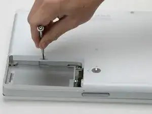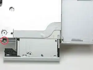 Выдвиньте оптический привод настолько, чтобы получить доступ и снять филипсовый винт рядом с отсеком батареи.