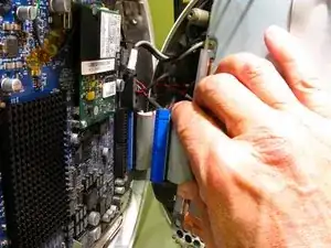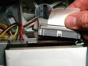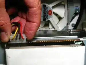Перед тем как вынимать несущую рамку, обратите внимание на прокладку проводов, особенно на красный, жёлтый и чёрный провода питания диска. Держите несущую рамку с обеих сторон и тяните прямо на себя. Она плотно сидит и может потребовать покачиваний, чтобы вынуть её.
