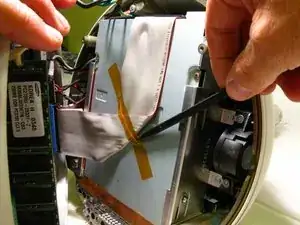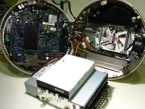 ВНИМАНИЕ! Если вы используете это руководство для разборки более ранней модели iMac G4, при снятии нижней части корпуса положение будет иным. В таких моделях есть фиксированный разъём, который отключается при отделении нижней части корпуса от верхней. Этот разъём расположен с левой стороны или со стороны карты AirPort. Проявляйте максимальную осторожность, равномерно прикладывая усилие при снятии, чтобы не выкрутить нижнюю часть корпуса и не погнуть контакты фиксированного разъёма.