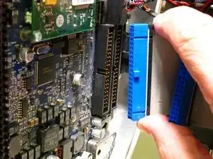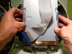 Осторожно откиньте нижнюю часть корпуса немного дальше и извлеките разъём кабеля данных оптического привода с платы, удерживая его по внешним кромкам и аккуратно выведя равномерными движениями, чтобы не согнуть контакты. Не тяните за плоский кабель, тяните только за синий пластиковый разъём.