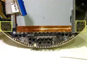 Освободите кабели AirPort и Bluetooth из белого пластикового зажима, установленного на верхнем левом крае несущей рамки. Просто нажмите на зажим, и он откроется.