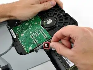 Поднимите жёсткий диск слегка и отключите разъём термодатчика жёсткого диска.