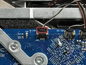 Отключите датчик температуры жёсткого диска, потянув его разъём вверх, к верху iMac.