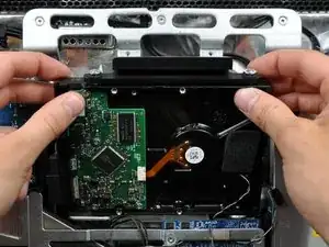 Нажмите кронштейн жёсткого диска вниз в сторону нижнего края iMac, чтобы освободить его от задней крышки, затем поверните верхнюю часть диска к себе.