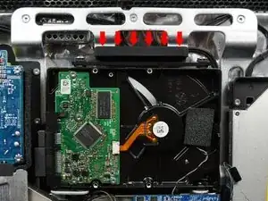 Нажатие на верхнюю часть кронштейна жёсткого диска, чтобы освободить его от задней крышки, требует значительной силы. Рекомендуем положить iMac лицевой частью вниз на стол, чтобы не опрокинуть его.