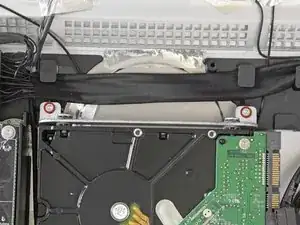 Выверните два винта Torx T10, крепящие жёсткий диск к корпусу iMac.