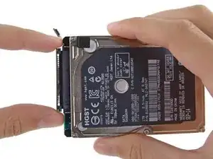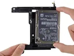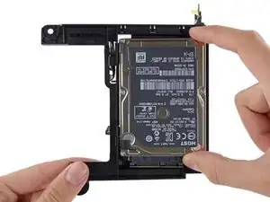 Удалите четыре винта T8 длиной 6,5 мм (по два с каждой стороны), крепящие жёсткий диск к лотку.