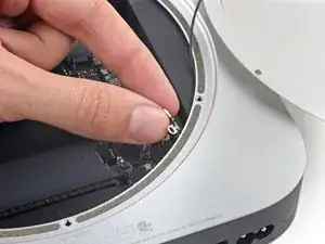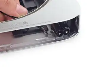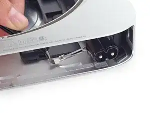 Используйте пинцет или пальцы, чтобы оттянуть скобу от разъёма питания переменного тока и удалить её из Mac mini.