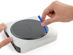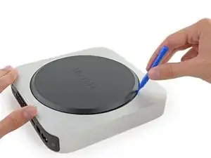 Используйте пластиковый инструмент для вскрытия, чтобы приподнять нижнюю крышку Mac mini.