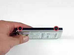Снимите два серебристых винта Torx T6 и чёрные резиновые амортизаторы с правой стороны жёсткого диска.