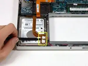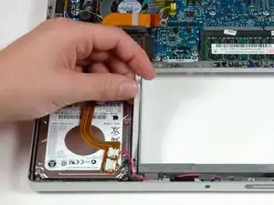 Отсоедините оранжевый шлейф жёсткого диска от логической платы.