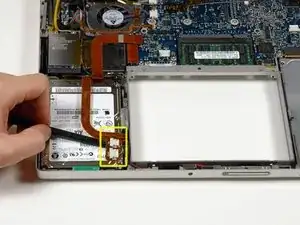 Выдвиньте плату Bluetooth из её слота рядом с жёстким диском. Плата Bluetooth всё ещё подключена к оранжевому кабелю жёсткого диска, поэтому не пытайтесь полностью её извлечь из компьютера.