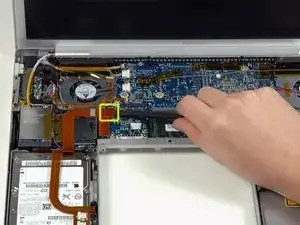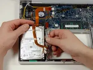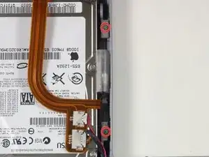 Отключите оранжевый ленточный кабель жёсткого диска от логической платы.