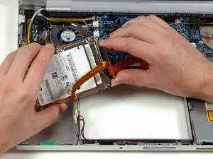 Отключите оранжевый ленточный кабель жёсткого диска.