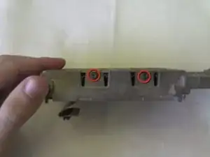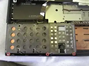 Переверните ноутбук и извлеките аккумулятор. Снимите три винта длиной 0,84 дюйма, показанные на изображении, используя отвертку Torx #9.