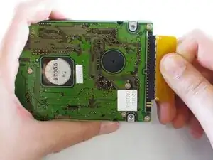 Поверните жёсткий диск на себя, чтобы получить доступ к ленточному кабелю, затем аккуратно потяните разъём кабеля вверх, чтобы извлечь кабель.