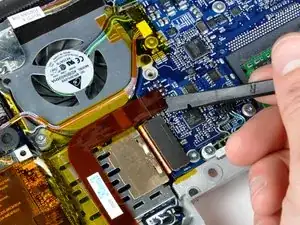 Будьте осторожны при отключении ленточного кабеля клавиатуры и тачпада, следя за тем, чтобы задняя часть верхней крышки была отсоединена от области возле петель. Легко случайно погнуть крепления винтов по обе стороны от клавиатуры.