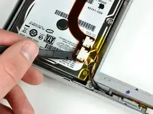Используйте лопатку, если ленточный кабель жёсткого диска плотно приклеен к верхней части диска. Возможно, придётся действовать медленно, чтобы не повредить его.