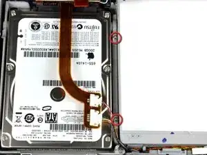 Выкрутите два винта Torx T6 длиной 8,2 мм, крепящих скобу жёсткого диска к нижней части корпуса.