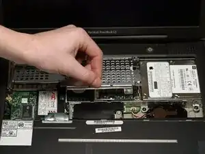 Возьмите пластиковую вкладку и потяните жёсткий диск вверх и влево, следя за тем, чтобы металлическая скоба не зацепилась за чёрный пластиковый корпус.