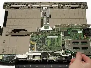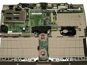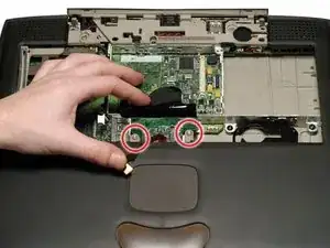 Снимите два длинных серебристых винта Torx с платы питания в центре ноутбука.