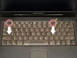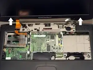 Снимите верхнюю крышку. Обратите внимание, что на передней части ноутбука есть две защёлки, которые часто мешают при съёме верхней крышки.