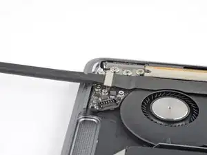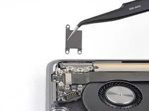 Используйте отвёртку T3 Torx, чтобы удалить три винта 1,4 мм, удерживающие кронштейн кабеля звуковой платы.
