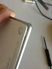 С помощью лопатки или маленькой отвертки с плоским лезвием осторожно разомкните герметик между белой пластиковой задней панелью и металлической верхней частью рядом с отверстием для отсутствующей ножки.