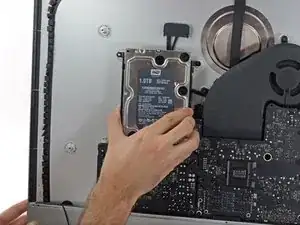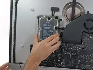 Удалите жесткий диск и левый крепеж жесткого диска из iMac.