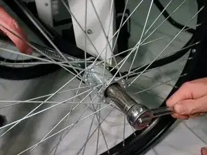 Отверните болт оси с помощью многофункционального инструмента Free Wheelchair Mission на головке болта и разводного ключа 19 мм на гайке.