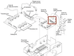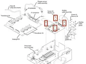 Снимите четыре винта и шайбы, которые крепят аналоговую плату к сборке пневматического блока.
