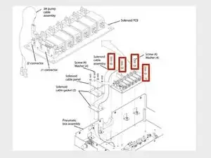 Снимите четыре винта и шайбы, которые крепят печатную плату соленоида к сборке пневматического блока.