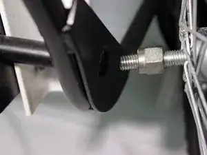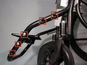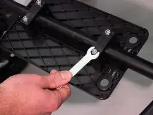 Используя гаечный ключ на 10 мм, закрепите перекладину подножки на передней раме, используя плоский болт и гайку, направленные к центру кресла.