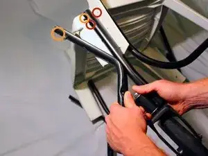Прикрепите ручной насос к правой задней части основной рамы, рядом с правым задним колесом. Сделайте это, используя последующий болт и круглую гайку.