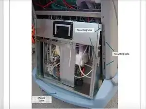 Тяните корпус вентилятора к себе, чтобы монтажные зажимы вышли из пазов рамы, и положите корпус вентилятора на пластиковый юбку сзади рабочего места, как показано на фотографии.
