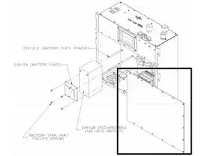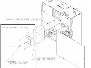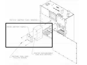 Снимите четыре винта с панельной головкой (SM0308P), удерживающих батарейную пластину (EV9109) и батарею (EV9108), и извлеките батарейную пластину и батарею.